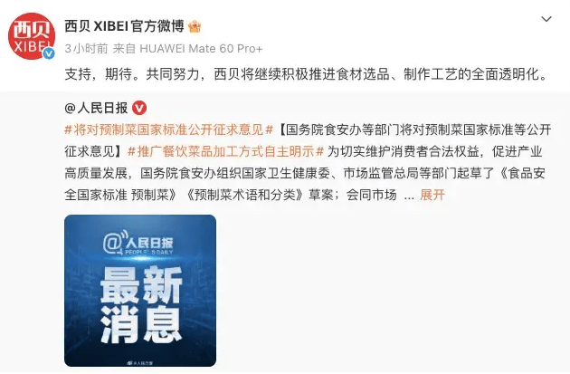 目前,我国对于预制菜的定义源于2024年3月市场监管总局等六部分发布的《关于加强预制菜食物平安监管 推进财产高质量成长的通知》(下称《通知》)。《通知》提到,预制菜是以一种或多种食用农产物及其成品为原料,利用或晦气用调味料等辅料,不添加防腐剂,经工业化预加工(如搅拌、腌制、滚揉、成型、炒、炸、烤、煮、蒸等)制成,配以或不配以调味料包,合适产物标签标明的储存、运输及发卖前提,加热或熟制后方可食用的预包拆菜肴,不包罗从食类食物。而市场监管总局相关司局担任同志就《通知》相关环境回覆记者提问时提到,地方厨房制做的菜肴,不纳入预制菜范畴,同时,仅经清洗、去皮、分切等简单加工未经烹制的净菜类食物,属于食用农产物,也不属于预制菜。《通知》中亦提到,正正在研究制定预制菜食物平安国度尺度。近两年时间过去,预制菜送来首个国度尺度,而西贝正在这场风浪中暂以“封闭102店”收尾。是消费者知情权、让消费者自从选择的主要办法。起首要具体而清晰地明白哪些餐饮制做体例该当。目前来看,为切实消费者权益,不只要推广餐饮环节利用预制菜,也要推广商家对地方厨房的预加工菜品进行。“预制菜”是一个中性词,不该被简单贴上“好”或“坏”的标签。预制菜不是劣质产物的代名词,它能够做到平安、优良、健康。其实,正在现有监管款式下,预制菜配套的供应链办理,从地方厨房到运输配送、餐厨存储等,曾经都有一系列的食物平安要求。近年来,曾经有餐饮企业先行一步发布所有食材的溯源演讲,并获得遍及承认。从实践看,自动预制菜的企业更能获得消费者信赖。泛博餐饮企业要视质量和平安为生命,愈加积极、热诚、无效回应社会关心,愈加自动采纳办法,守好平安底线。当晚,“西贝XIBEI微博”发文回应预制菜国度尺度等公开收罗看法:支撑,等候。配合勤奋,西贝将继续积极推材选品、制做工艺的全面通明化。