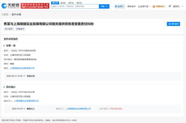 10月14日,近日,上海绿捷实业成长无限公司新增1条被施行人消息,施行标的27万余元,涉及供给劳务者义务胶葛案件,施行法院为上海市闵行区,申请施行报酬焦某。
